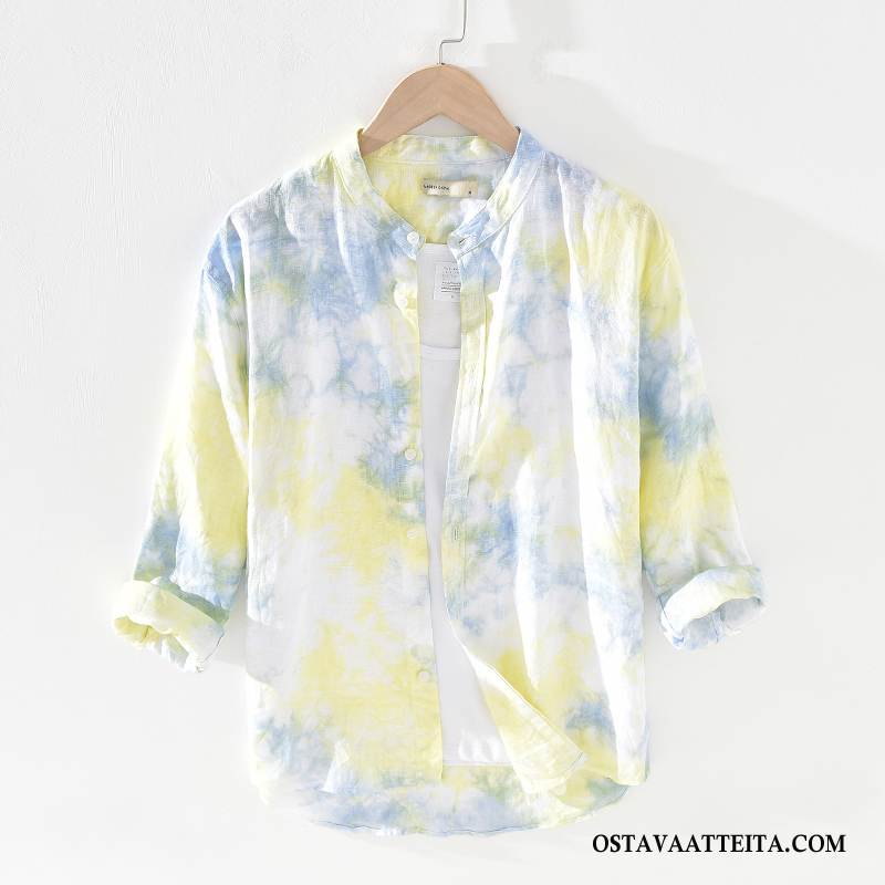 Paita Miesten Korkea Kaulus Raita Sininen Tuore Kesä Puuvilla Ja Liinavaatteet